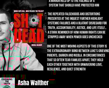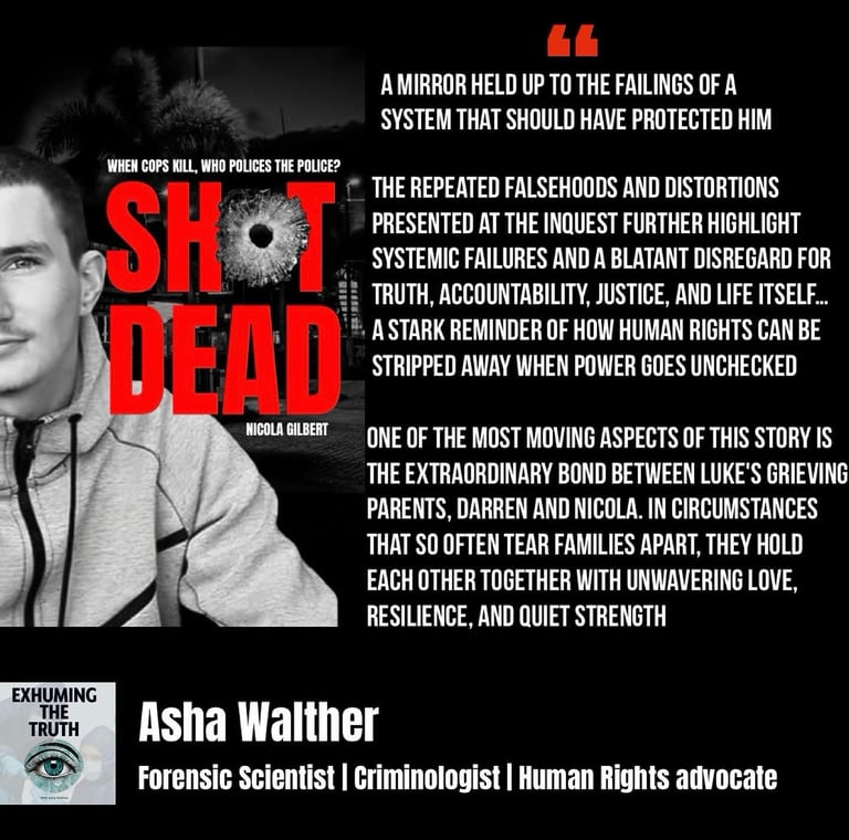"Shot Dead - When Police Kill, Who Polices the Police?" is a book written by Luke's Mother, Nicola Gilbert, giving a raw and honest recount of the injustices that saw not just the death of Luke, but the blatant disregard for accountability and honesty the Gilbert family have been forced to endure.